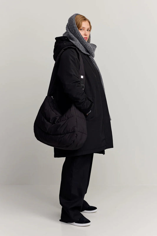 Bought it on a shopping trip. Have not taken it of yet… warm and stylish, goes with every outfit, and extremely comfortable. Love it!