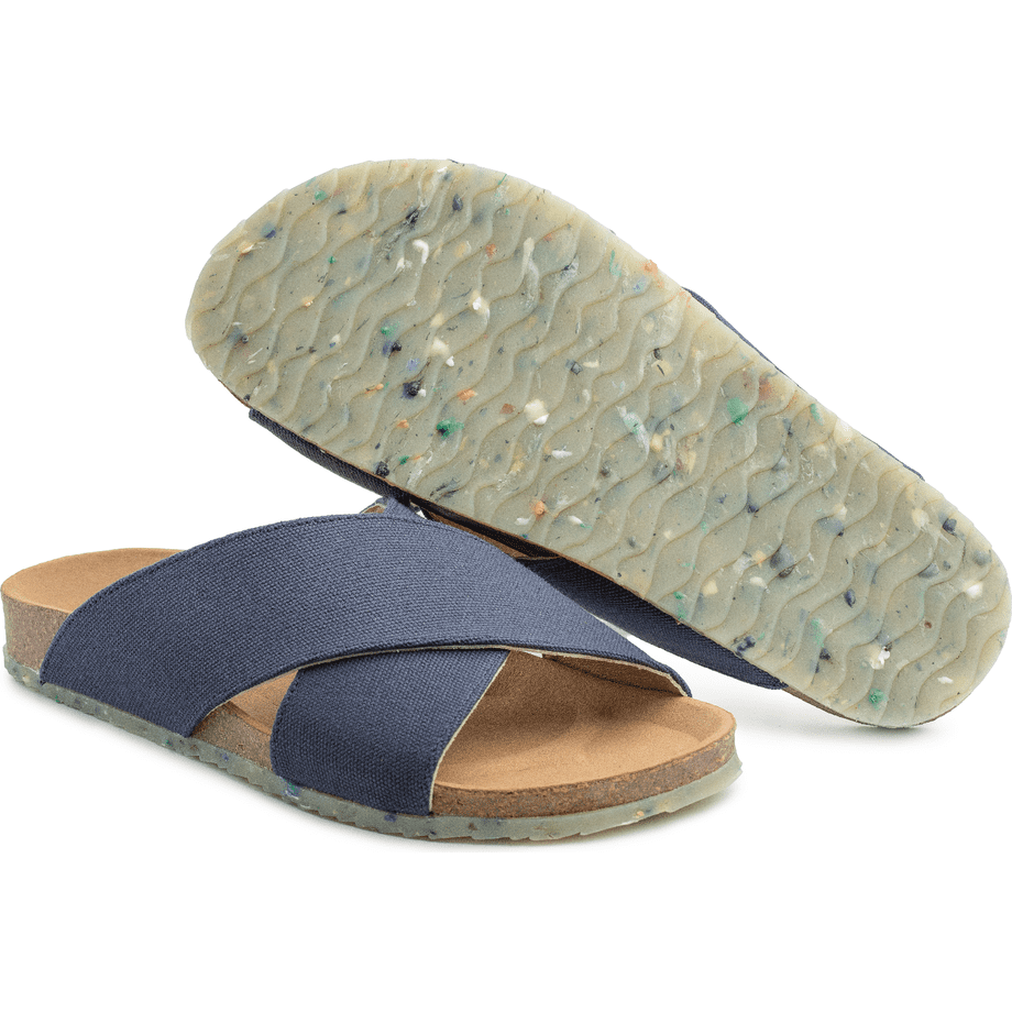 Super comfortable & cool slippers made of organic cotton (GOTS and FairTrade certified), a highly comfortable insole made of natural rubber and cork and an outsole made of natural rubber and plastic waste particles from the Atlantic Ocean.