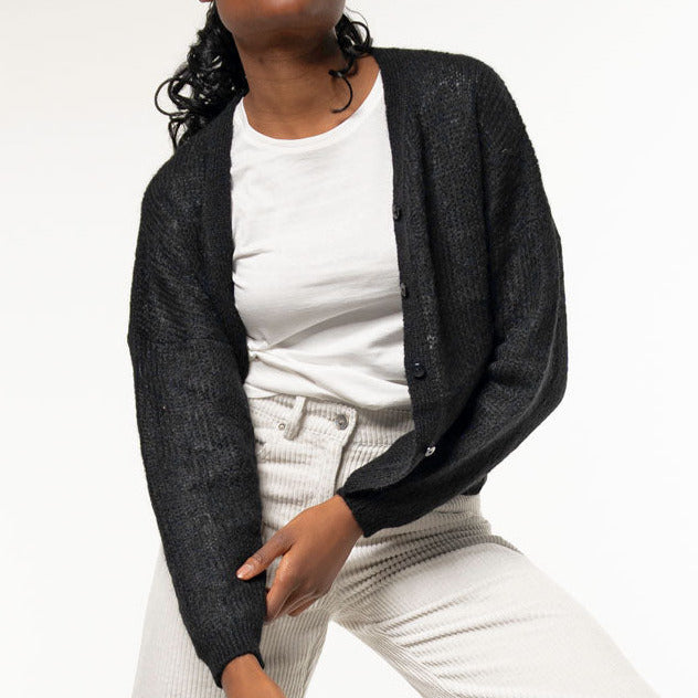 Diese Strickjacke hat einen lockeren und kurzen Schnitt mit angenehm weiten Ärmeln. Ihr glatter Strick sorgt rundum für einen seidigen Schimmer. Mit umlaufenden Bündchen an Saum, Ärmeln sowie an Ausschnitt und Knopfleisten bekommt sie eine gute Passform und kann mit Knöpfen aus geschlossen werden.