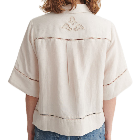 Die Arina Bluse ist eine luftig leichte Kurzarm-Bluse mit Durchbruchdetails vorne und hinten und einer Stickerei zwischen den Schulterblättern, sie passt zu allen Gelegenheiten und zu vielen Looks.