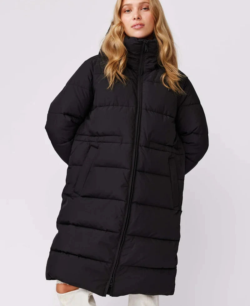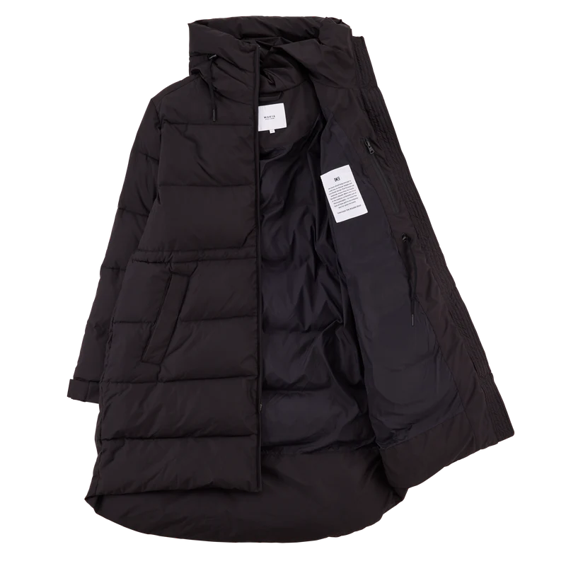 Maren ist ein mittellanger Puffer-Mantel mit Isolationsschicht aus Sorona®-Kunstdaunen aus recykeltem Polyester. Mit dem Gürtel, der auch weggelassen werden kann, bringt man Maren näher an die Taille. Warm im Winter, gleichzeitig aber atmungsaktiv genug, um auch bei milderen Temperaturen getragen zu werden. Dieser locker geschnittene Mantel hat Reißverschlusstaschen.