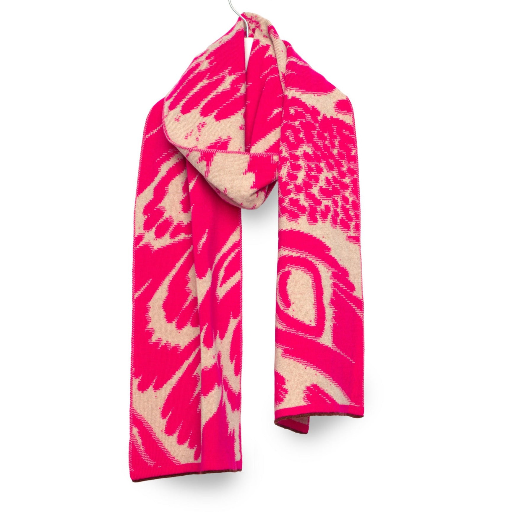 Strickschal mit eingestricktem beidseitigem Jaquardmuster inspiriert von Flügeln von Nachtfaltern.